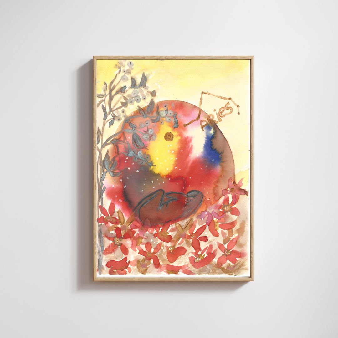 Aries is an original A4 mixed media painting that carries the bold, fiery presence of the Aries energy in a subtle yet expressive way.