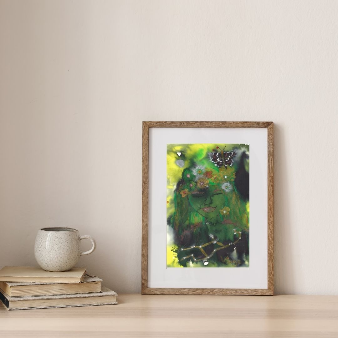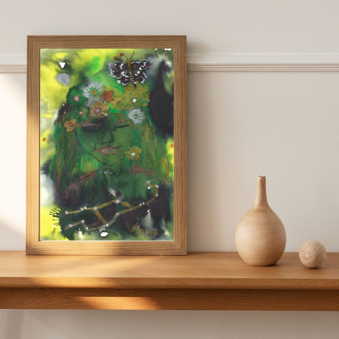 Virgo Goddess is a stunning, one-of-a-kind A4 painting that captures the essence of beauty and strength. Featuring a woman’s serene face with closed eyes, a butterfly nestled in her hair, and the Virgo constellation subtly integrated in gold, this piece combines elegance and cosmic allure. The color palette of black, green, and gold creates a harmonious blend that draws the viewer in with its calming yet powerful presence.