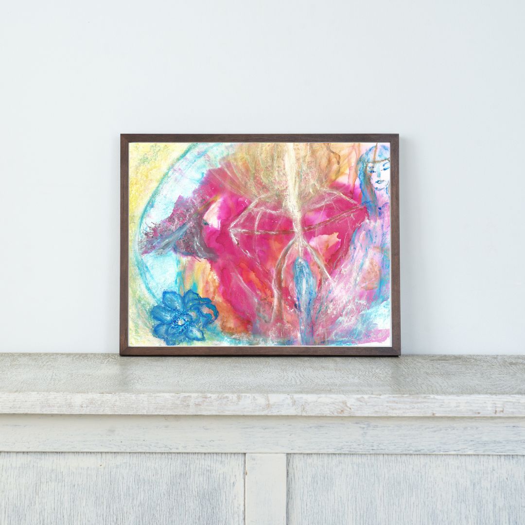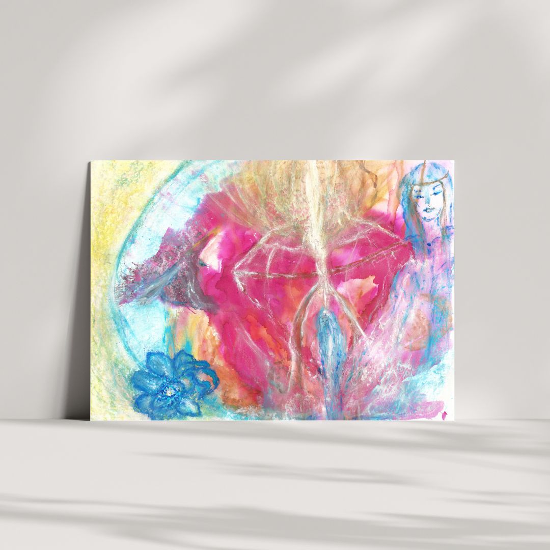 Expanding Your Pink Diamond is an original watercolour artwork that channels the powerful, nurturing energy of Mother Mary. The soft pink hues symbolize self-love, while the pink diamond at the heart of the piece represents a woman’s strength, resilience, and personal power. Standing within the radiant diamond, the woman is surrounded by Mother Mary’s healing energy, guiding her towards greater empowerment.