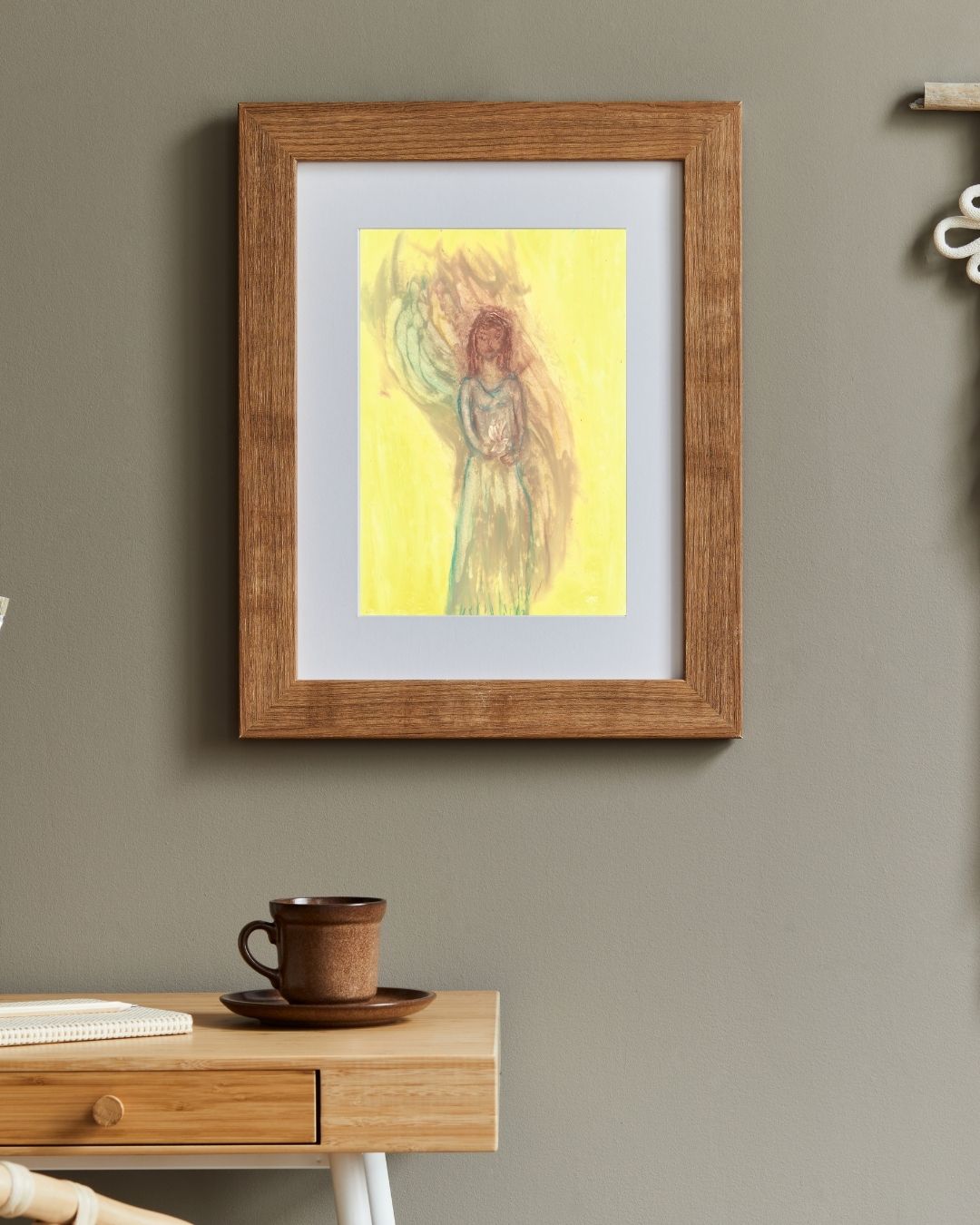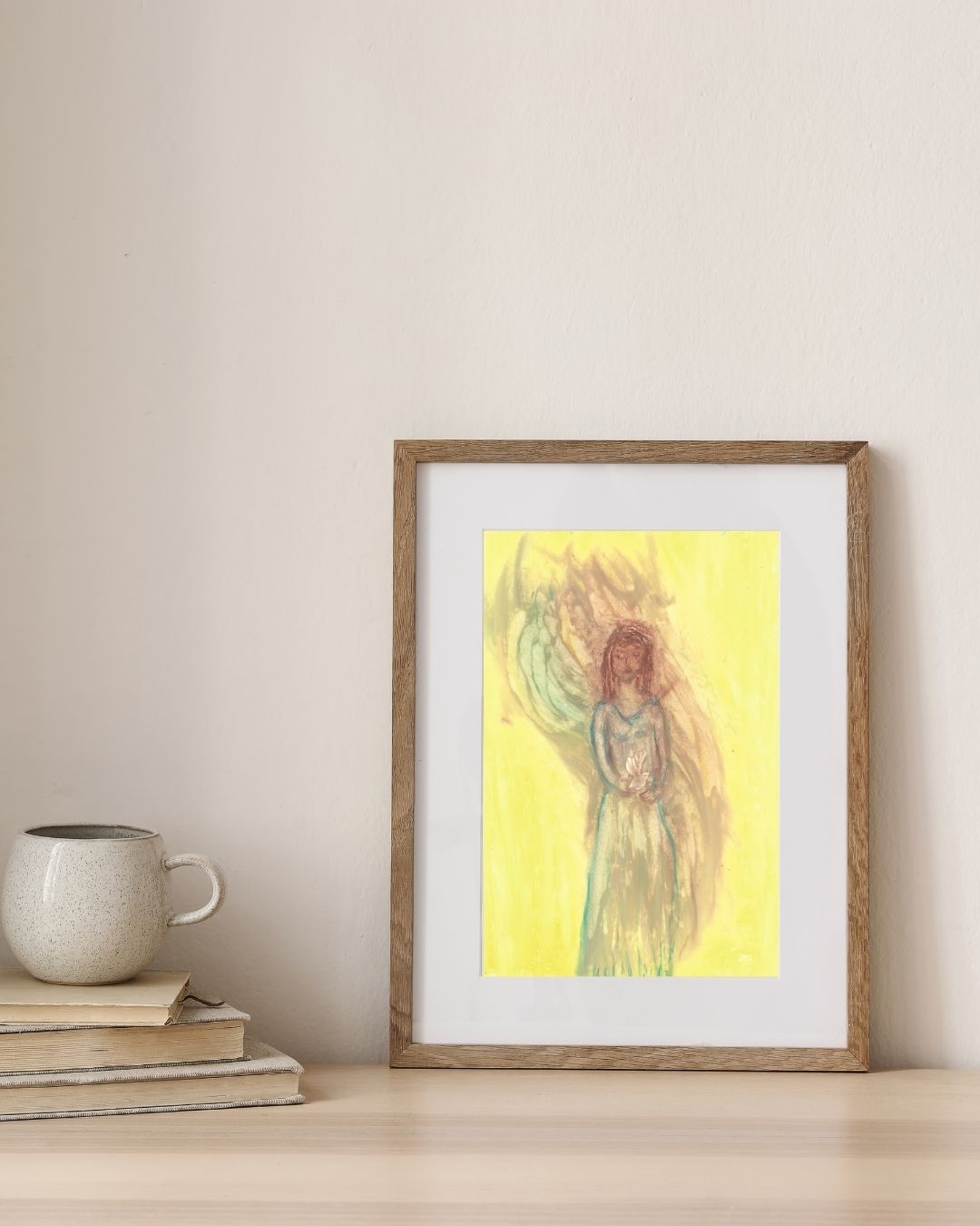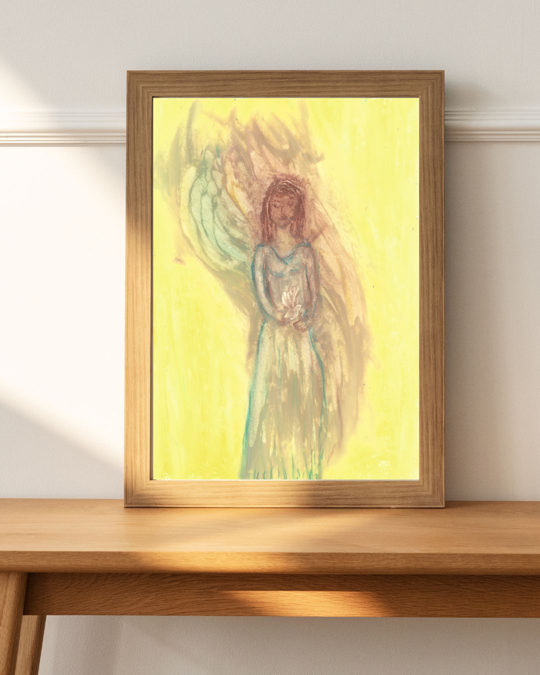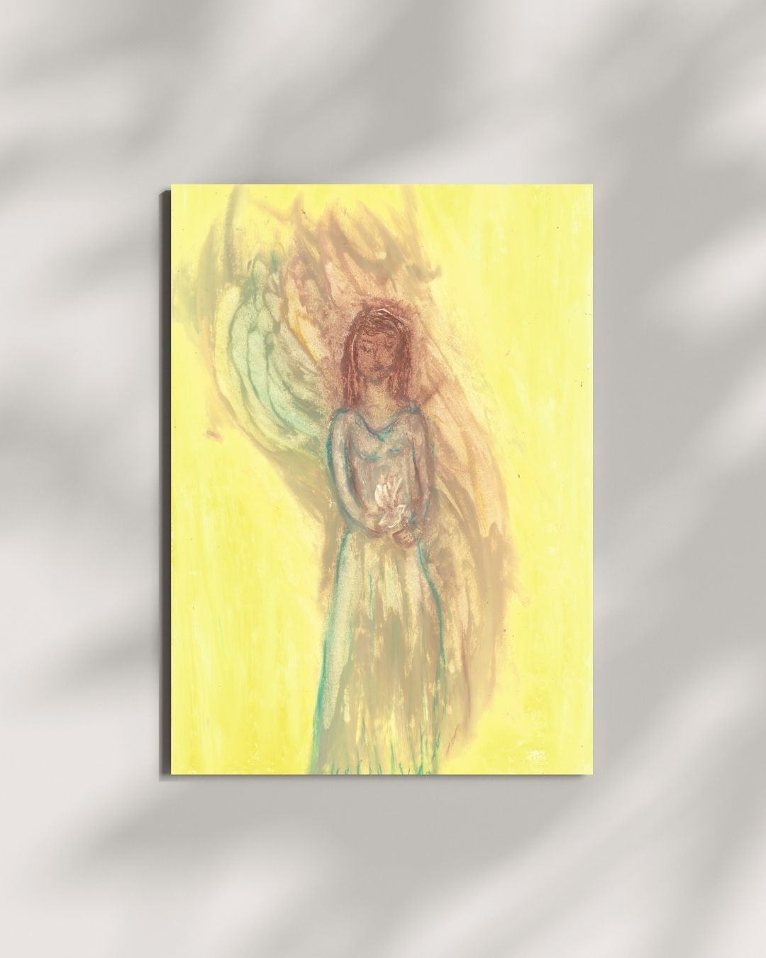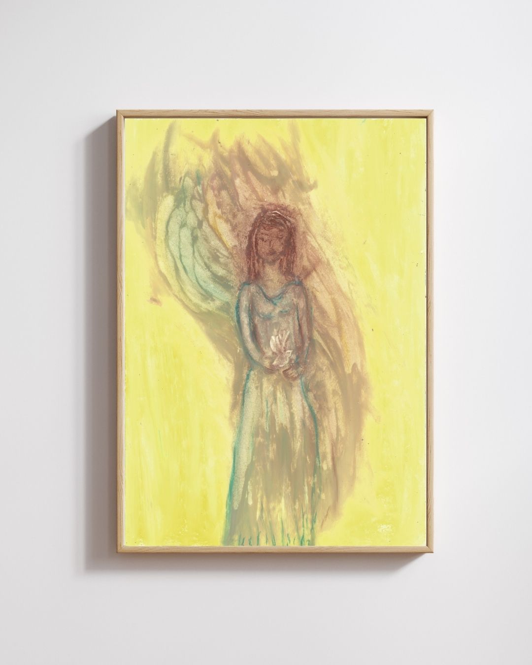Holy Dove is a beautiful oil pastel artwork that captures the essence of peace, grace, and spiritual connection. This piece features a woman with brown hair holding a dove, symbolizing serenity and harmony. The soft yellow background enhances the uplifting energy of the dove, evoking a sense of spiritual calm and reflection. Holy Dove serves as a reminder of the peaceful energies that surround us and the importance of embracing grace in our lives. The gentle tones and thoughtful composition make it an ideal addition to any space that seeks to inspire tranquility and balance.