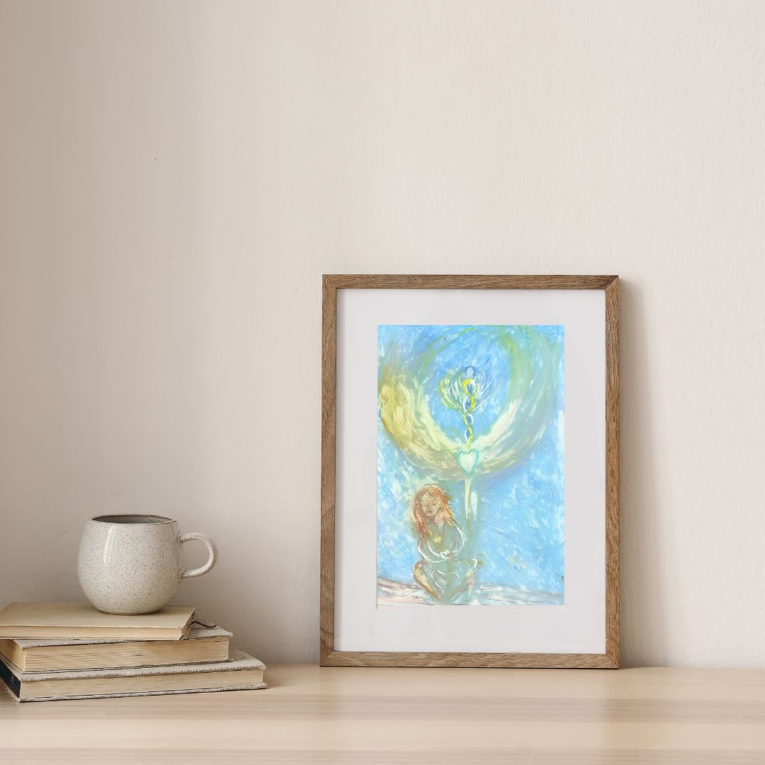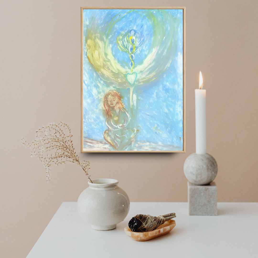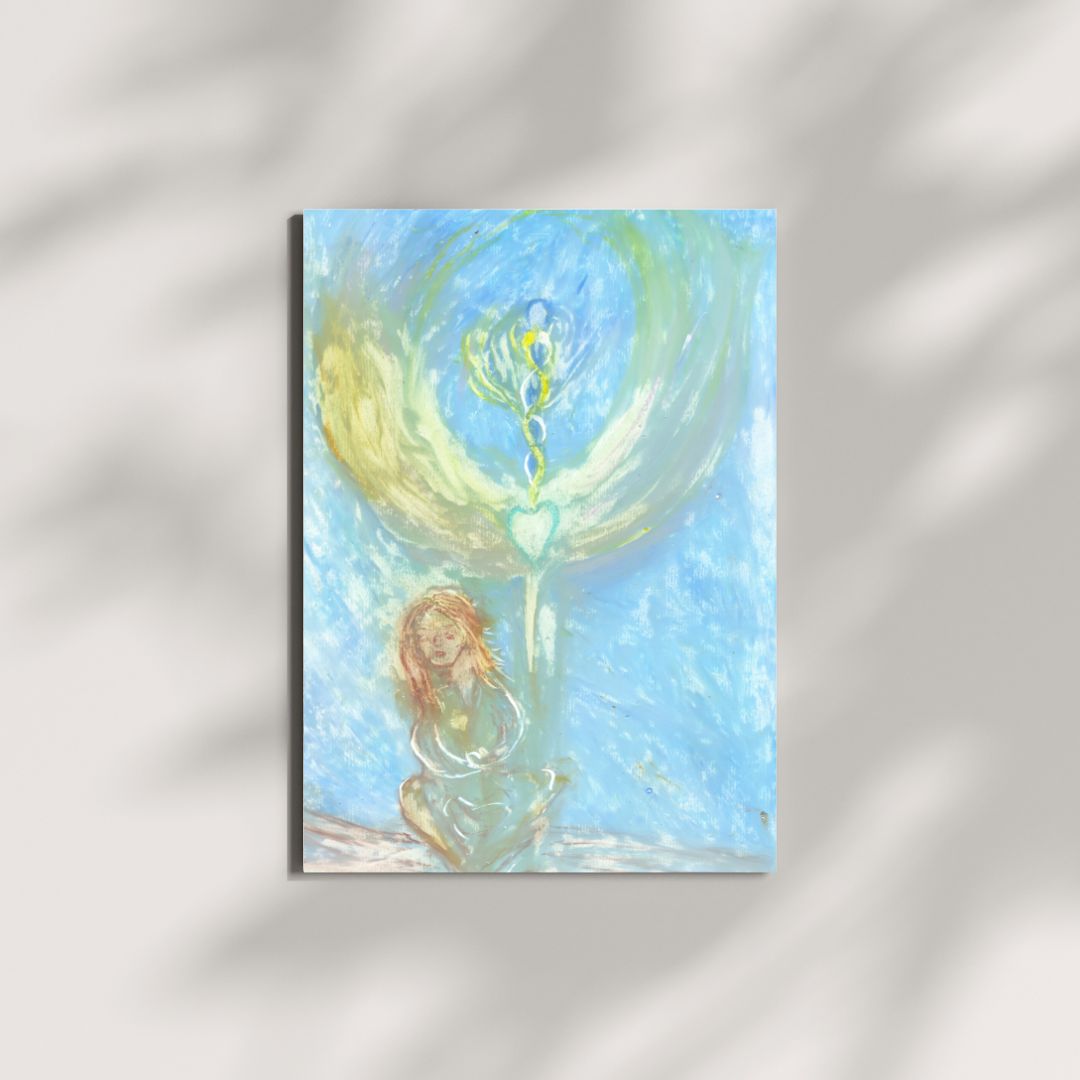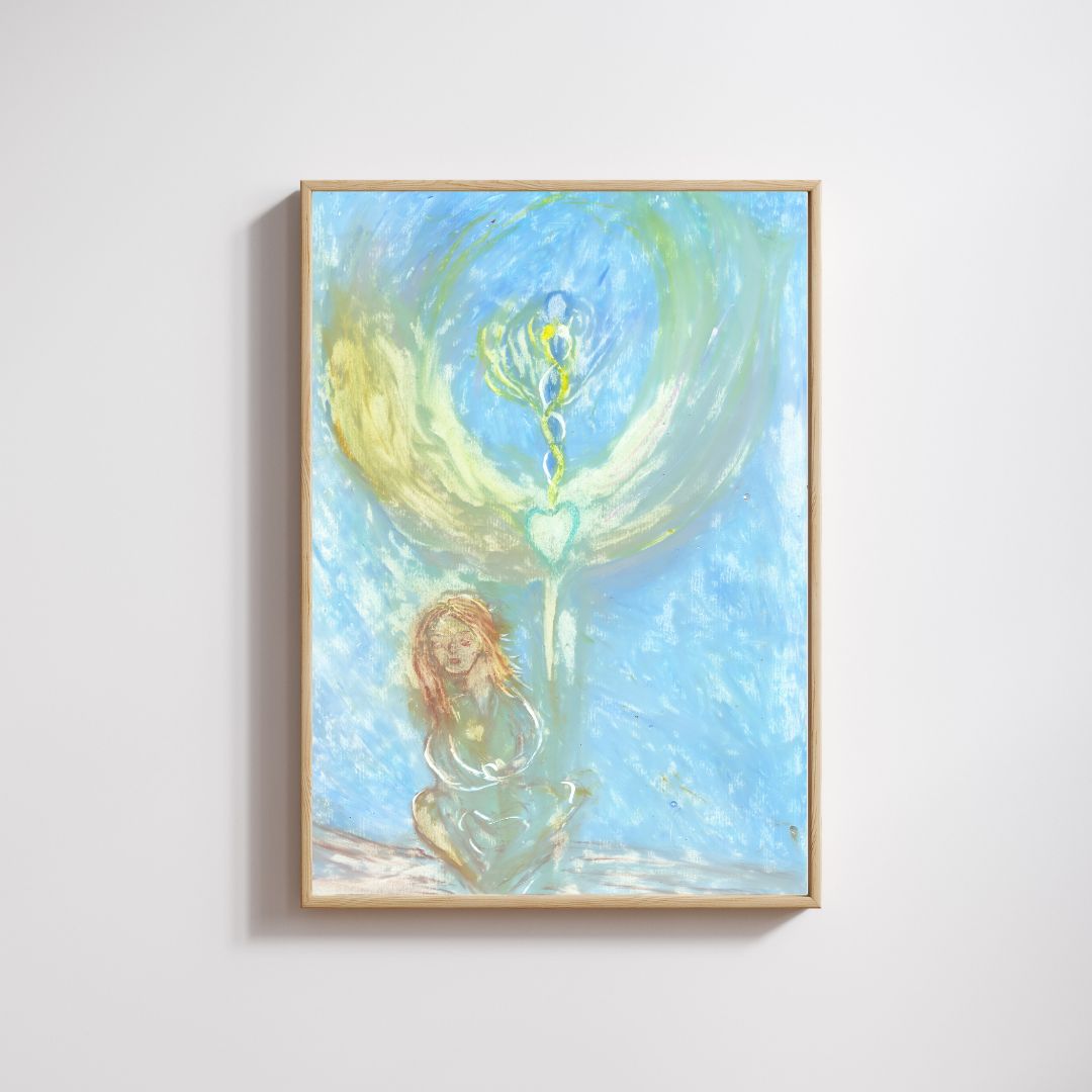 This original A4-size artwork radiates tranquility and spiritual connection. The painting features a seated woman with flowing hair, depicted in soft, earthy tones. A luminous heart emerges at the center, with delicate, intertwining light spirals extending upward, symbolizing growth, love, and divine alignment. Surrounding her is an angelic winged form, glowing with shades of green and yellow, creating an aura of protection and serenity. The background, in soothing blue, evokes the vastness of the sky and the boundless energy of the soul.