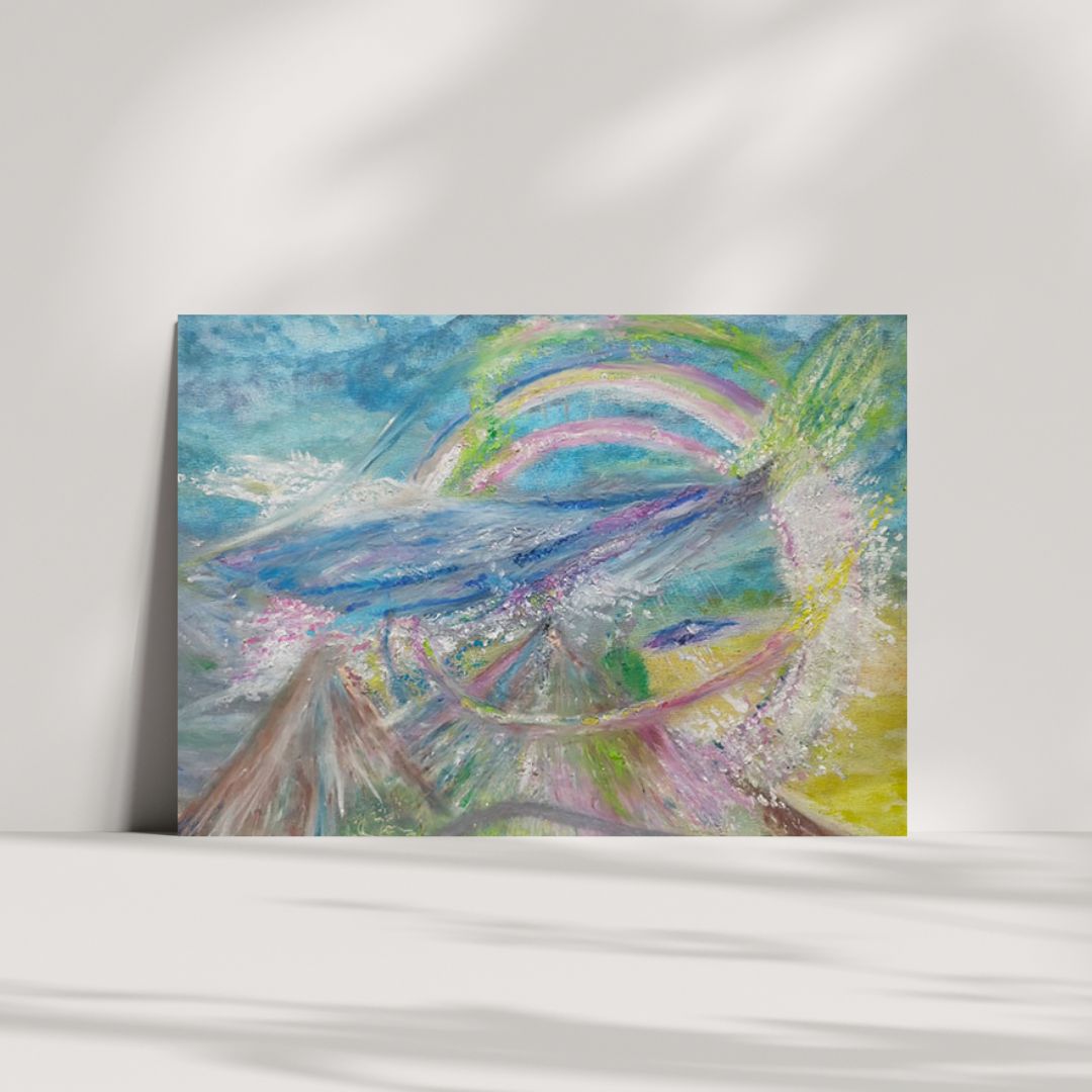 Mount Shasta is a captivating original artwork that brings together the beauty of nature with a touch of the mystical. The painting features the iconic Mount Shasta, painted in earthy tones of brown, green, white, and soft pink. Above the mountain, a blue spaceship hovers while a smaller ship enters a portal surrounded by two ethereal circles. The soft pastel hues of blue, pink, and green create a serene and otherworldly atmosphere, making it a truly mesmerizing piece.