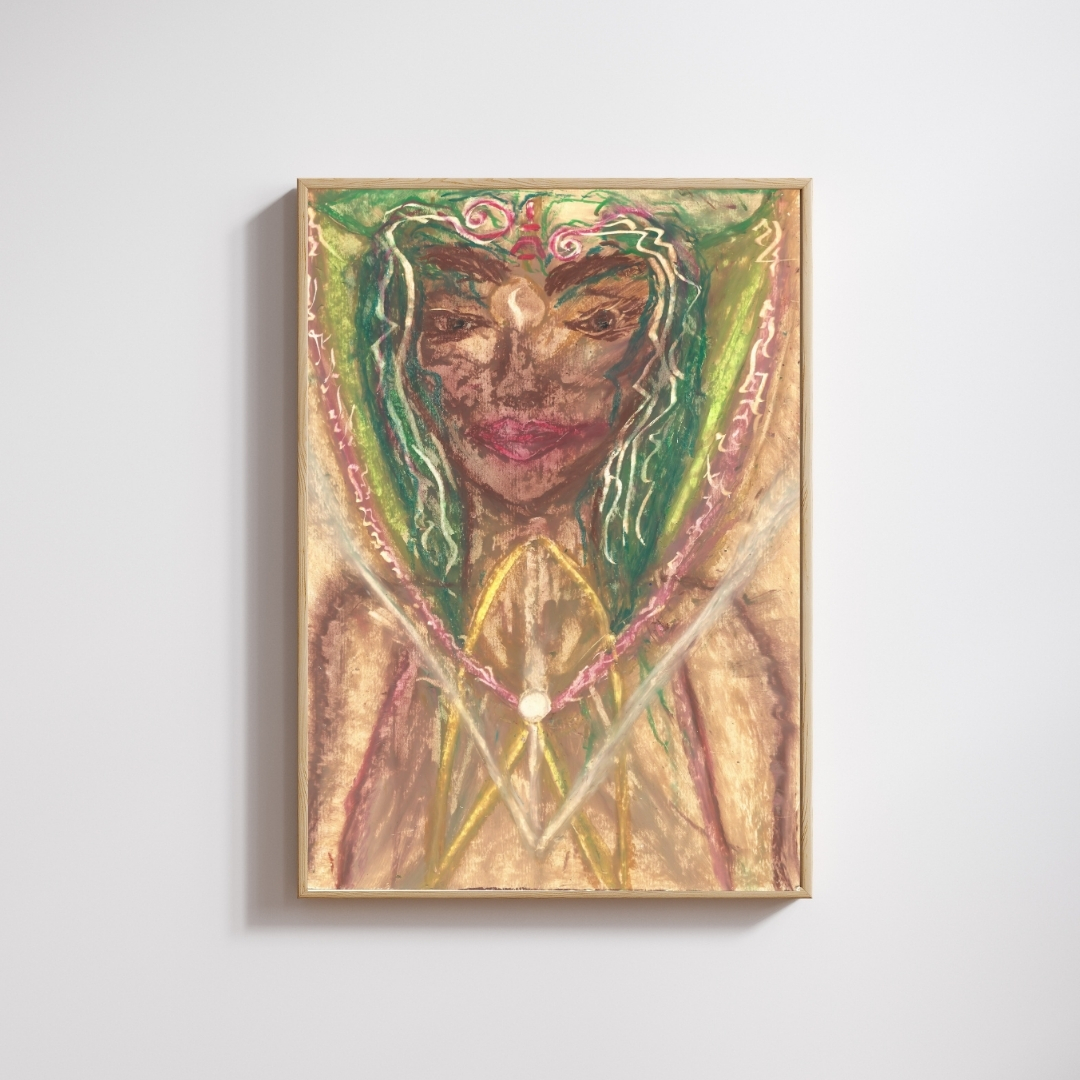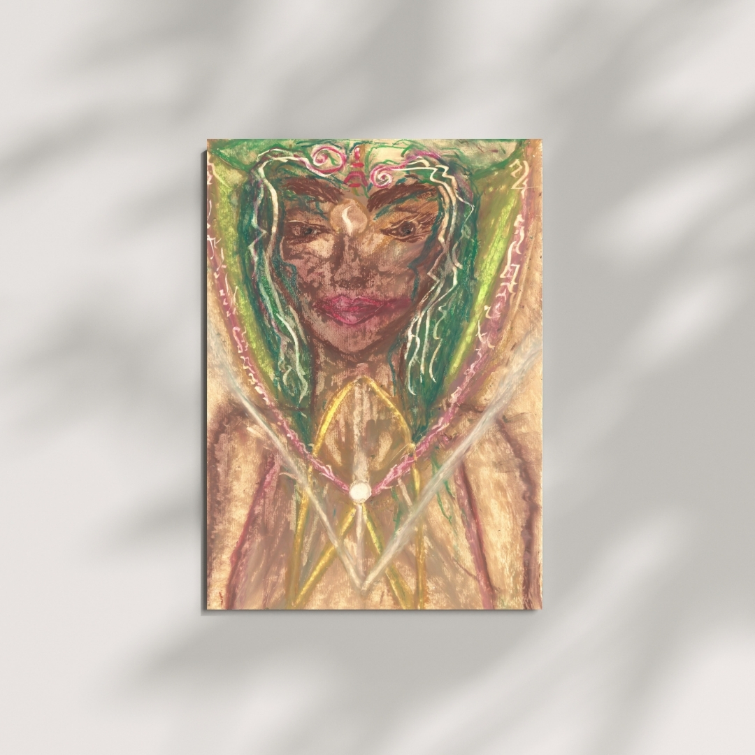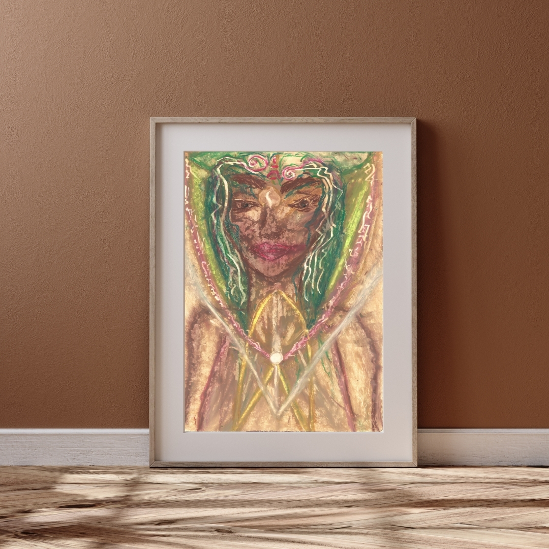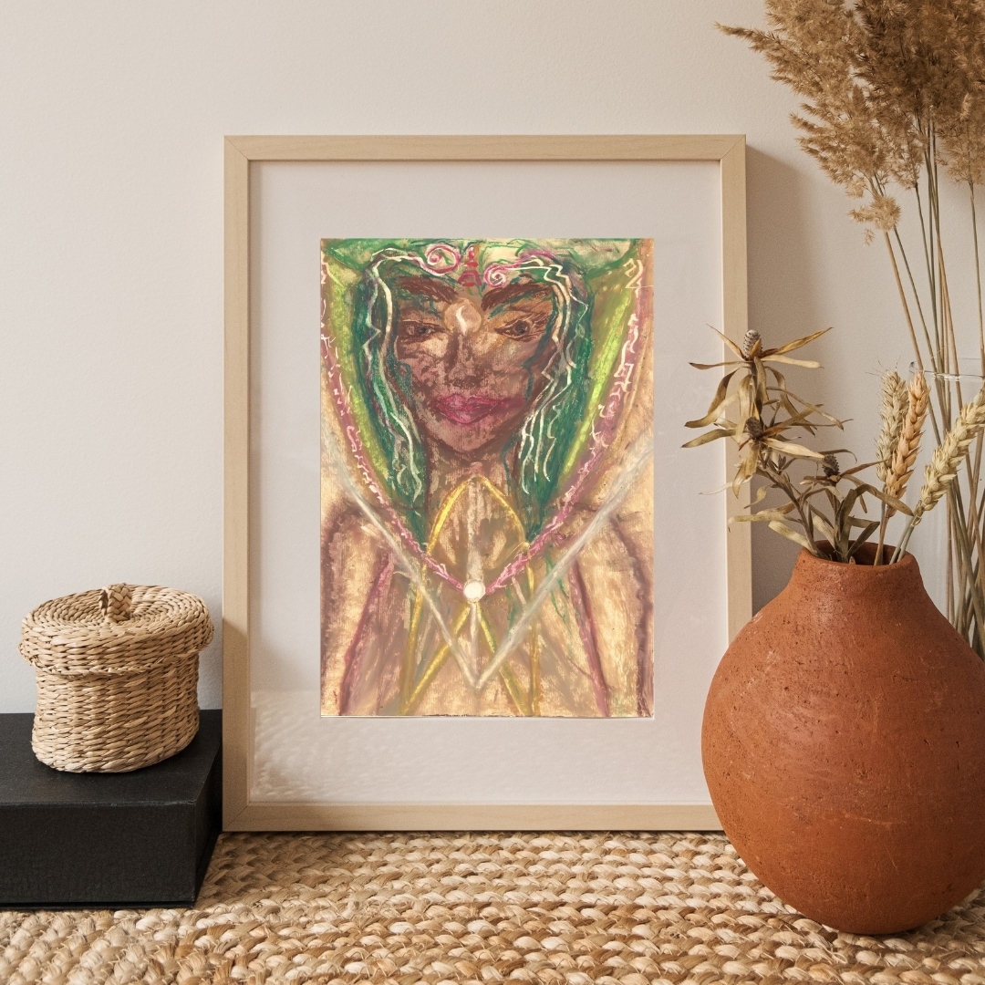 Nectar of Life is an original A4 oil pastel painting that embodies vitality, wisdom, and divine connection. The artwork features a mystical female figure with flowing green hair, golden geometric patterns, and ethereal light language symbols. The earthy brown and green tones create a grounding yet whimsical atmosphere, making it a perfect addition to boho interiors or for those who appreciate soulful, whimsical portraits.