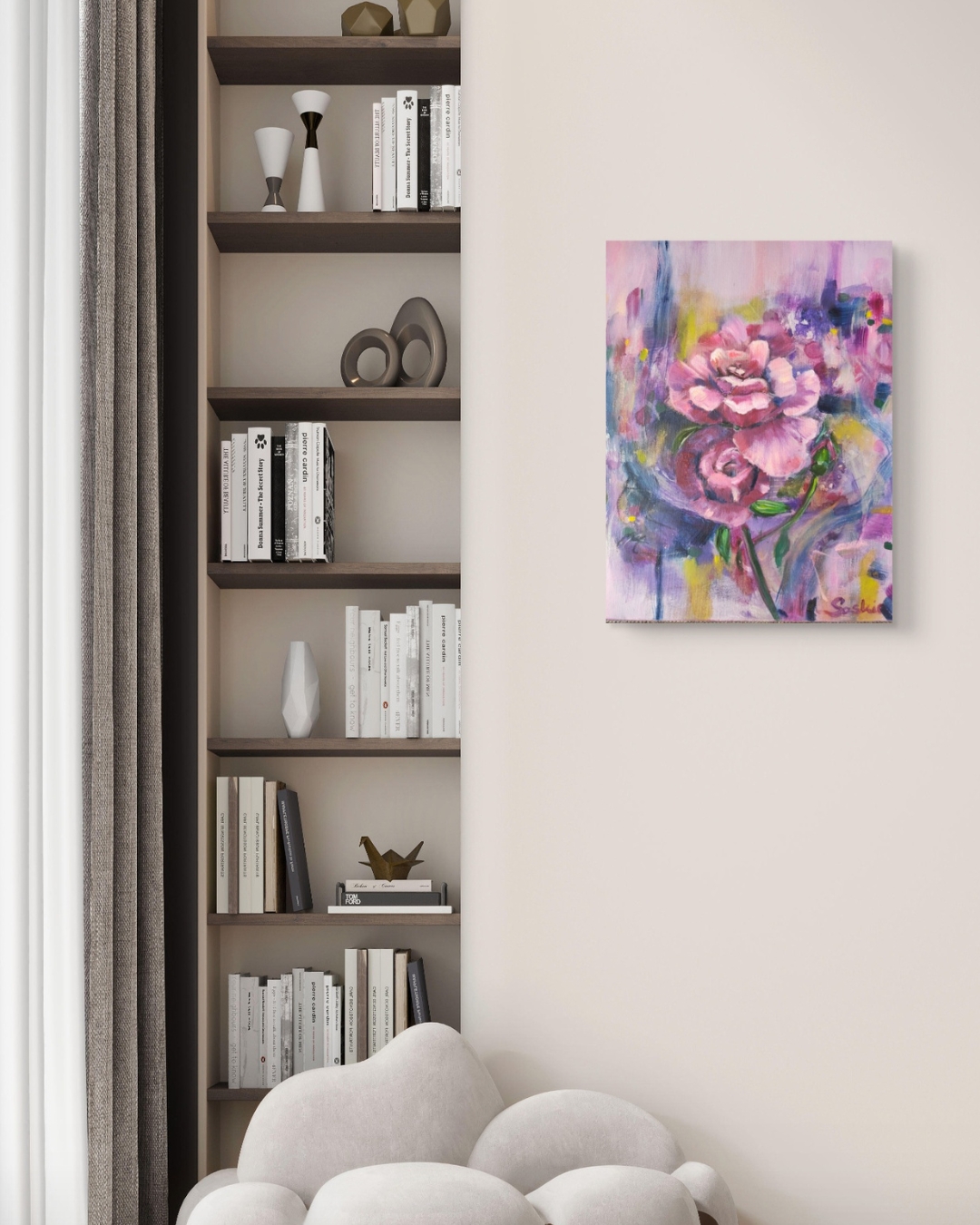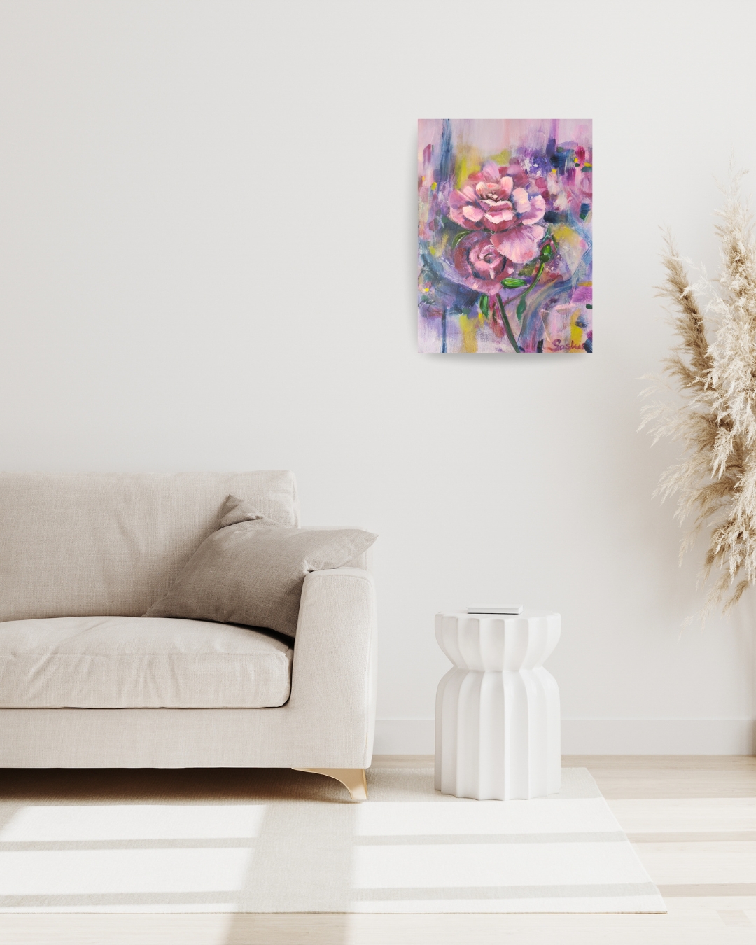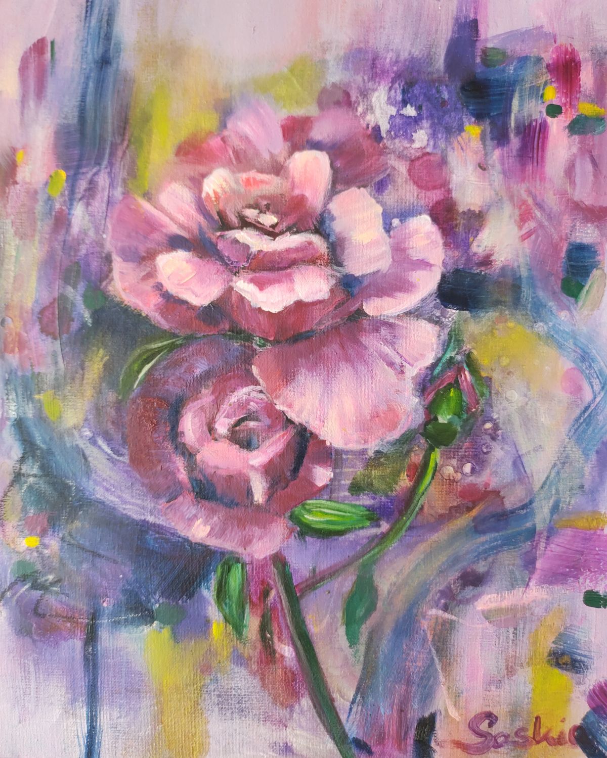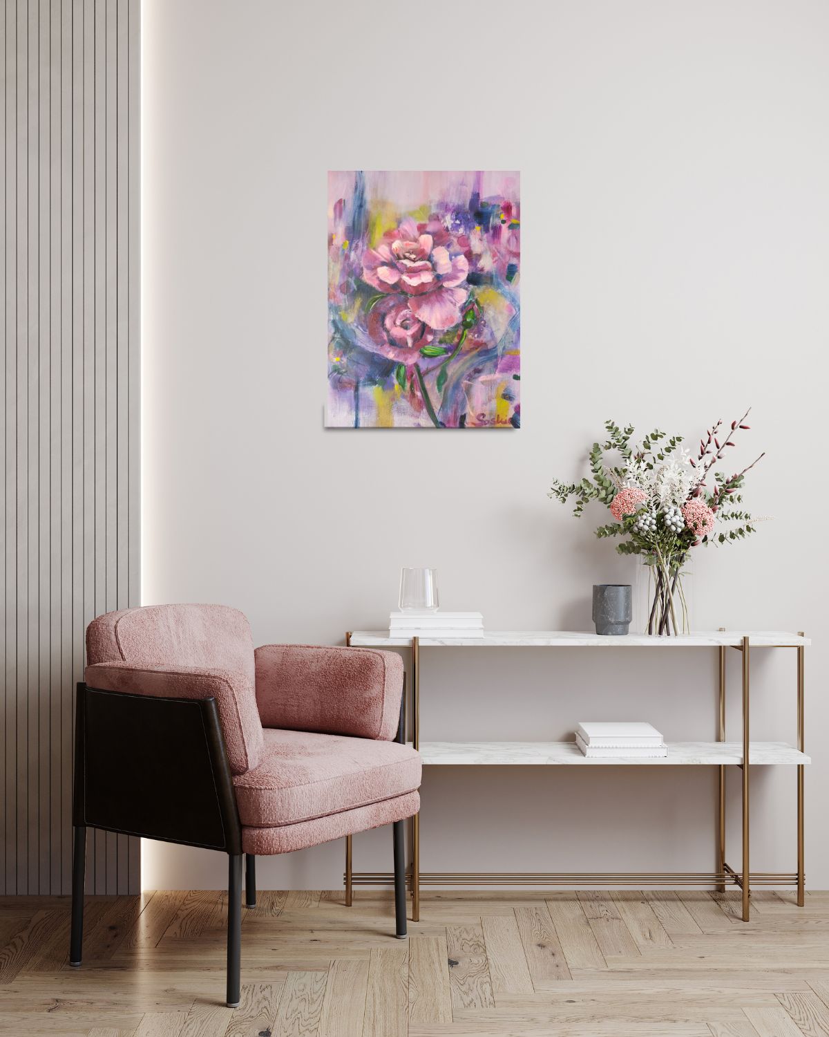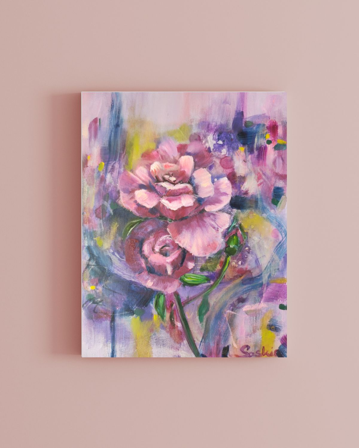 Rose 20 – The Time of Fulfillment is an original mixed media painting, created with acrylics and oil paint. Three pink roses take center stage: two in full bloom and one still in bud. Set against a dreamy backdrop of lilac and violet, they seem to emerge in quiet reverence — a soft ritual of ripening and surrender.