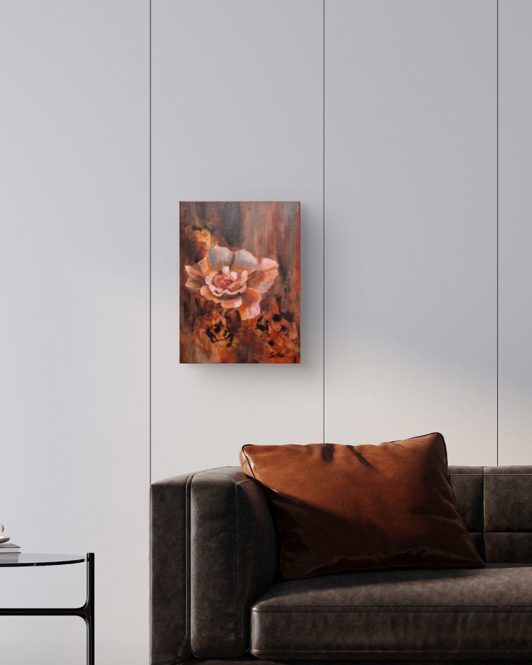 A single rose unfolds at the heart of this piece — her petals kissed with soft peach, ivory, and the faintest blush, glowing against a richly layered backdrop of deep earthy tones. Brushstrokes drift like smoke, while hints of bronze and burnt umber create an atmosphere that feels both raw and refined. It’s nature’s resilience, dressed in elegance.