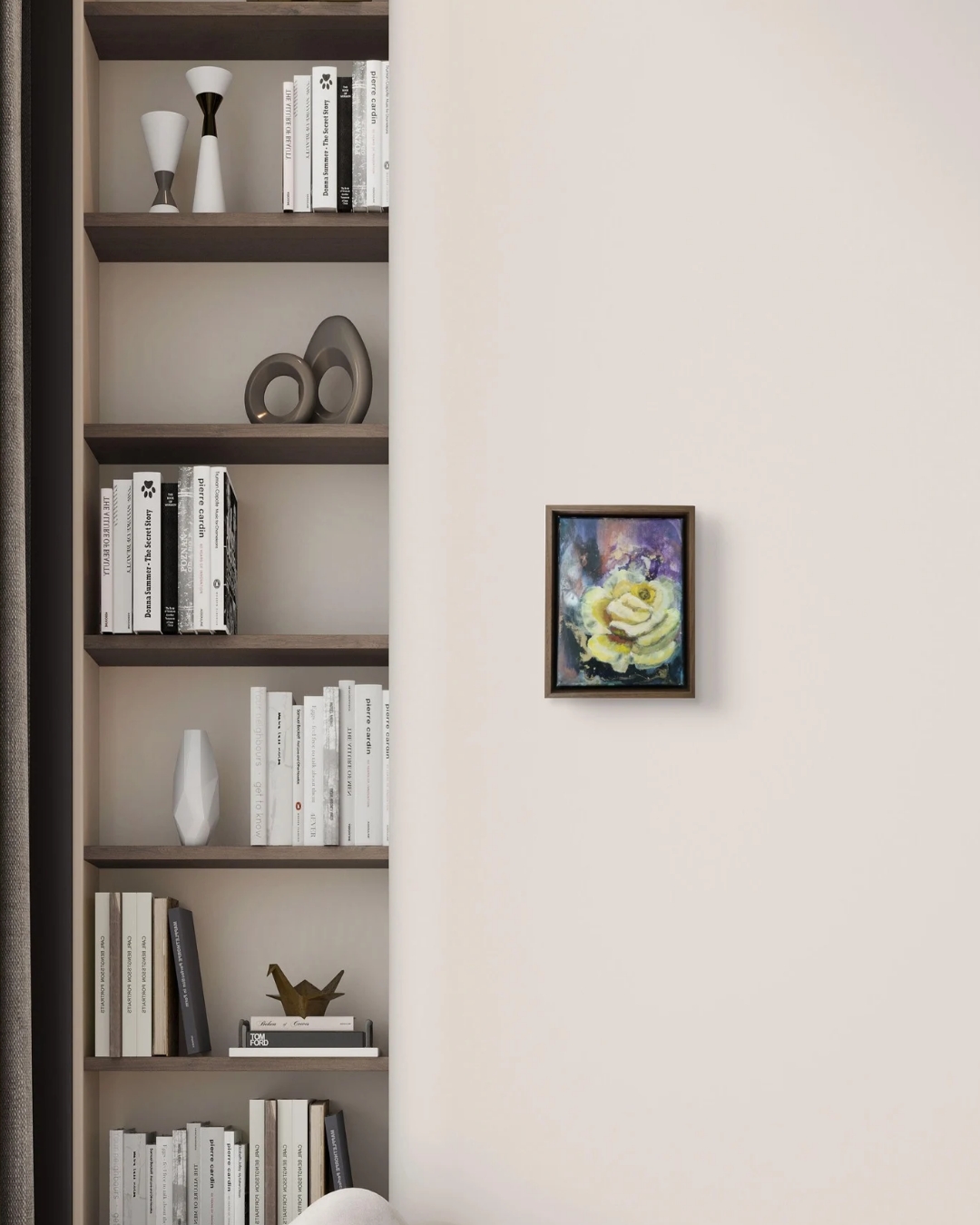 Rose 10 – Golden Bloom is an exquisite original artwork created with a combination of acrylic and oil paint, featuring a radiant yellow rose at its heart. The rose’s petals unfold with a soft, luminous glow, set against a rich abstract background of deep purple and metallic bronze. The interplay of colors adds a sense of movement, contrast, and depth, evoking both tranquility and intrigue. The intricate textures of the painting bring the rose to life, while the warm bronze highlights shimmer, adding a touch of elegance and mystique.