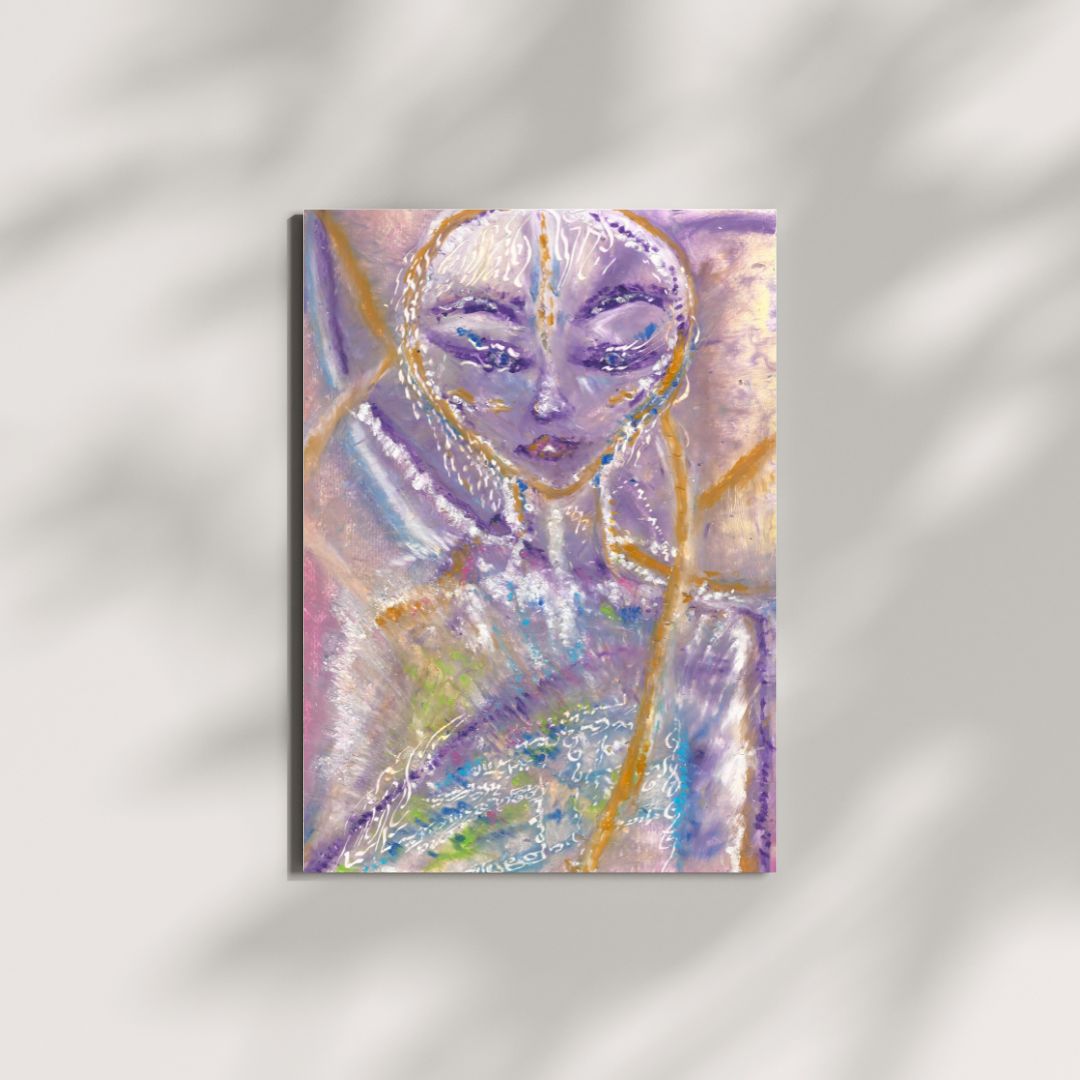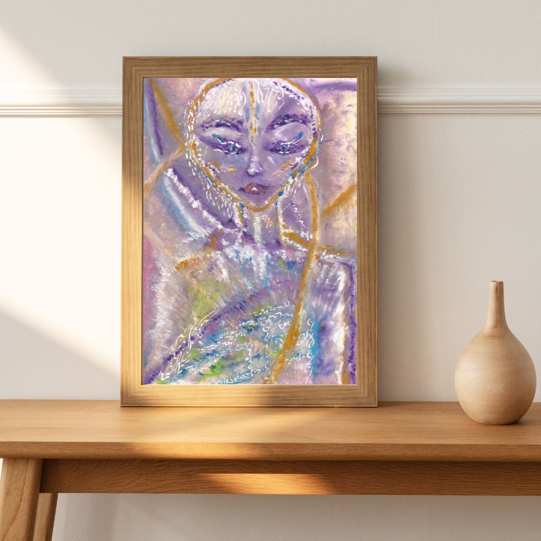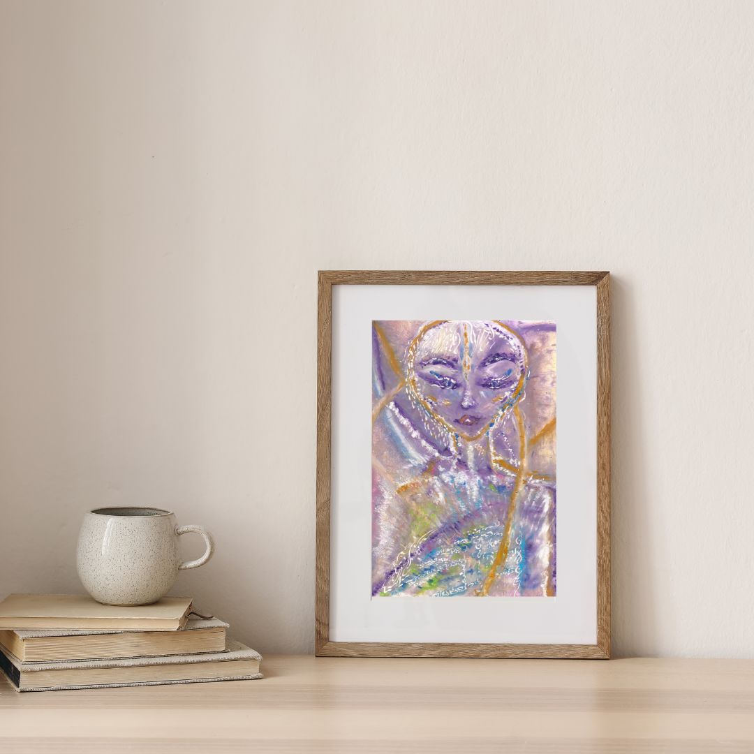 Time Lines is an ethereal oil pastel artwork that captures the essence of divine connection and higher wisdom. Featuring a celestial figure with delicate light language symbols woven into its form, this painting embodies spiritual energy and intuitive guidance. The soft hues of purple, gold, and pastel tones blend harmoniously, creating a luminous, multidimensional effect. This piece radiates serenity, inviting you to connect with your inner light and higher consciousness.
