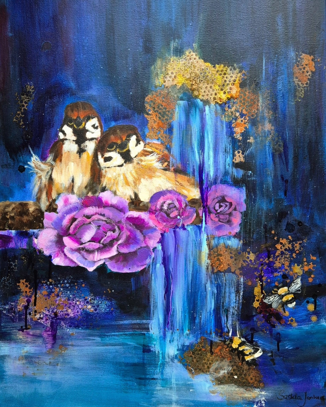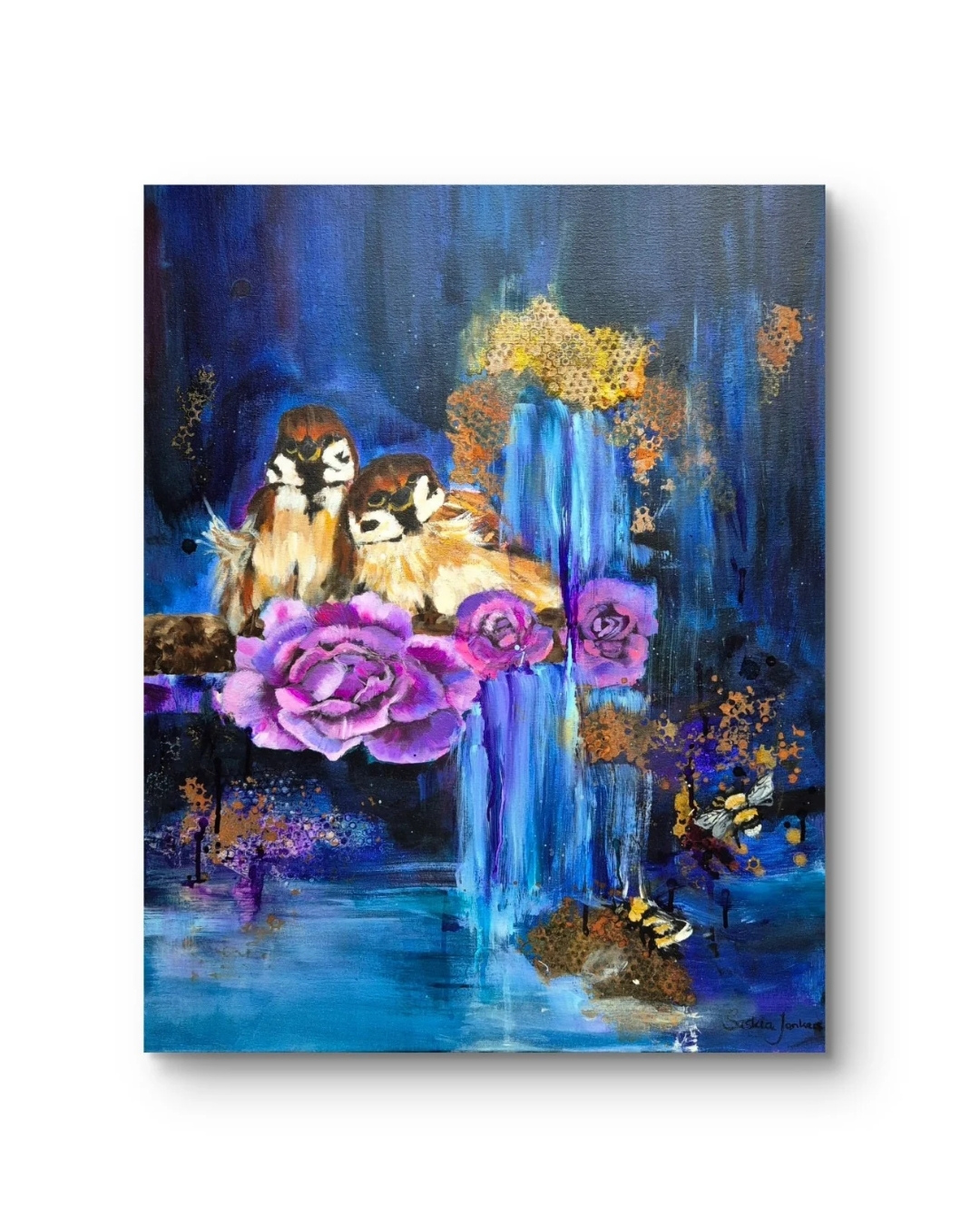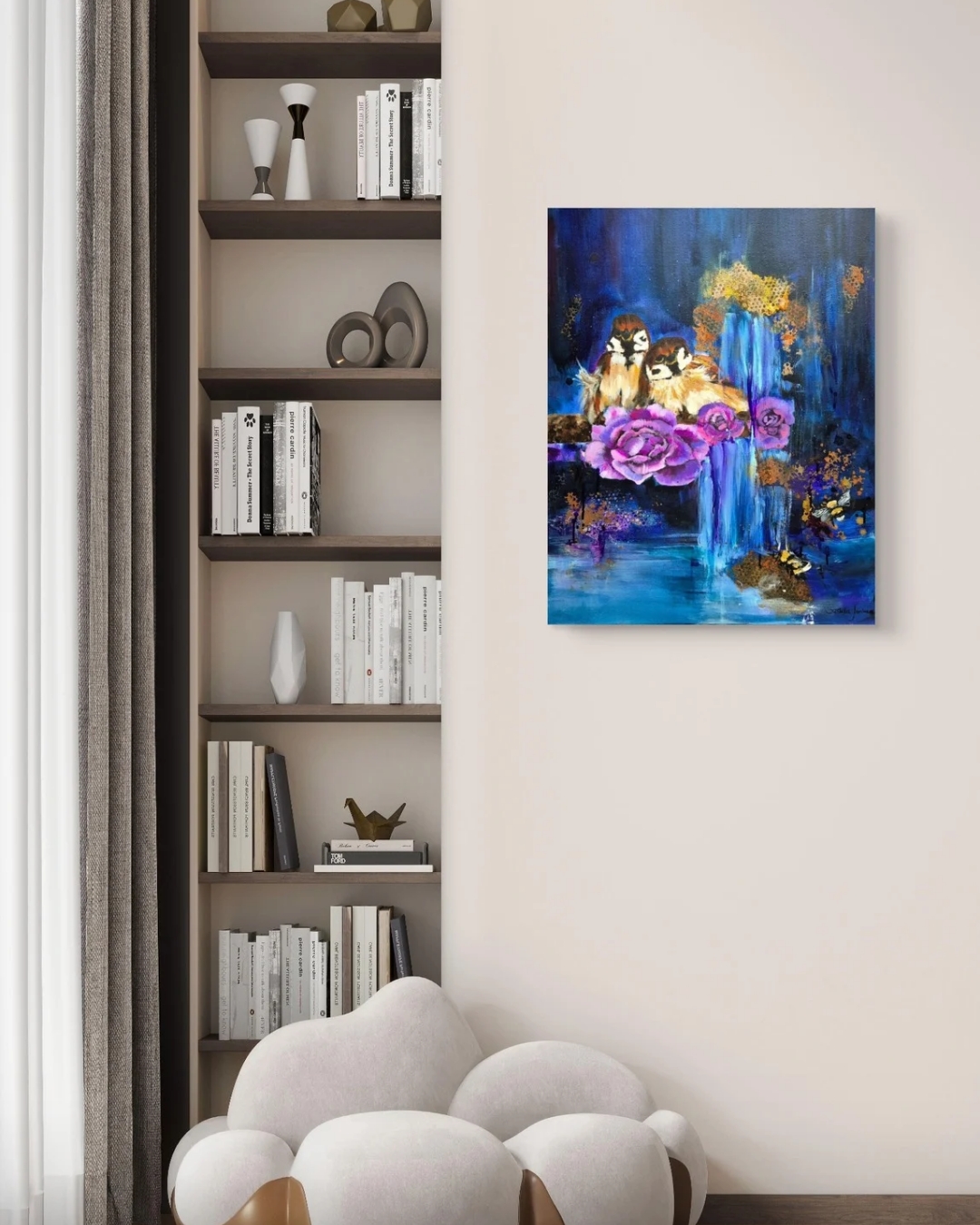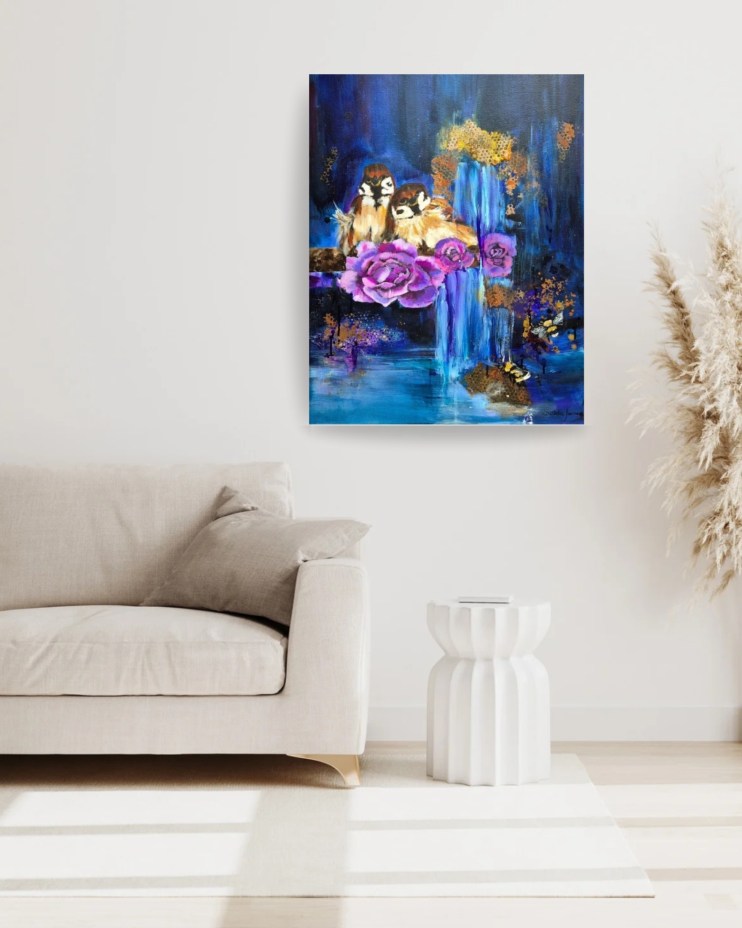 Step into a serene, countryside-inspired moment in the Austrian Alps. Two sparrows rest side by side on a slender branch, surrounded by soft purple roses. Behind them, waterfalls tumble gently, inspired by the pristine alpine streams, while tiny bees drift lazily through the air. Hints of blue and turquoise mingle with violet, earthy tones, and subtle touches of gold, creating a space that feels alive yet wonderfully calm.