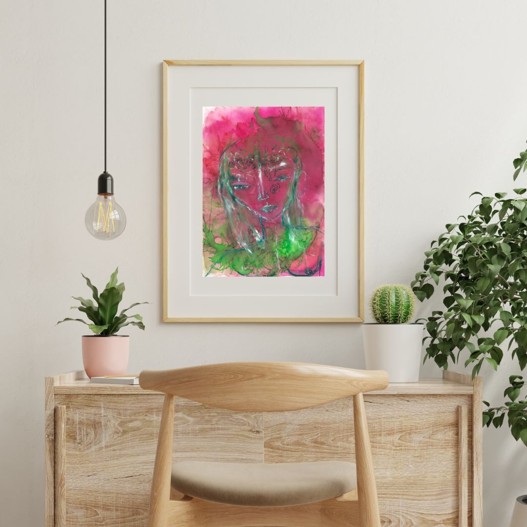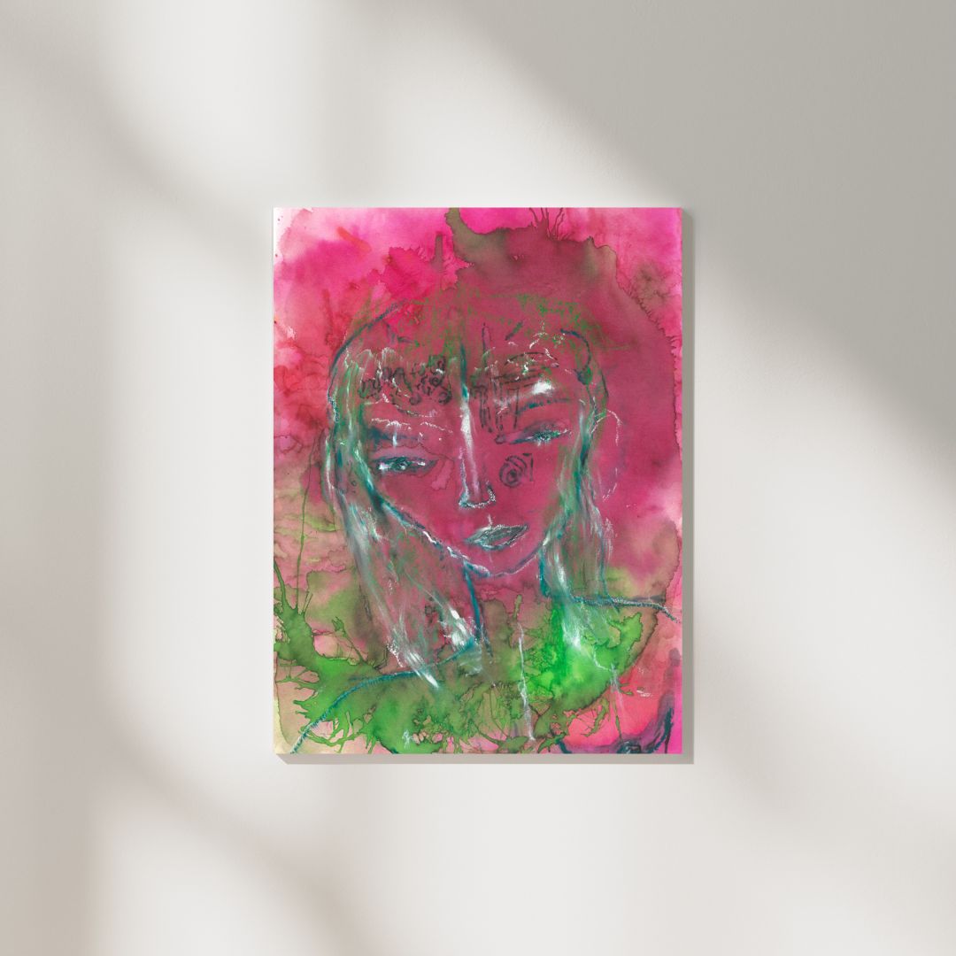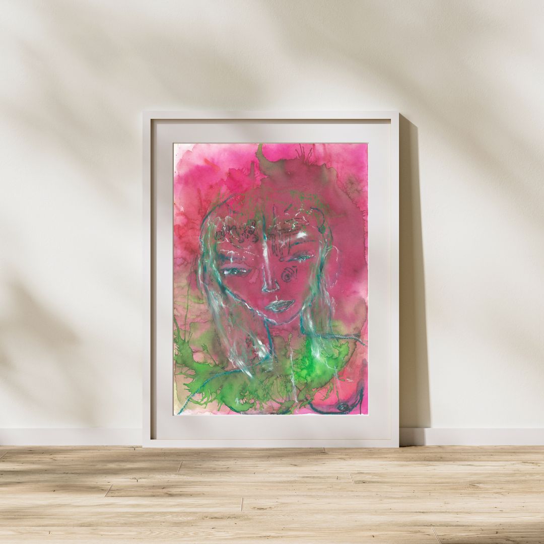 Zaia is a vibrant A3 oil pastel artwork that embodies the raw power of feminine energy and emotional depth. With expressive strokes and flowing lines, this piece features a mystical female figure, emerging from layers of bold pink, green, and subtle blue hues. Her gaze is inward, inviting you to connect with your own heart, intuition, and creativity.